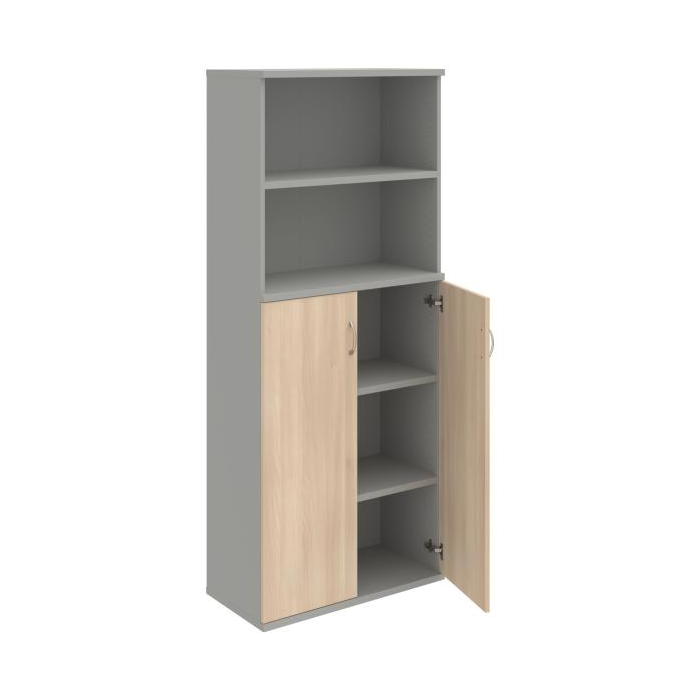 Kombinovaná skriňa - dvere/nika. Kancelárske skrine STRONG majú robustnú konštrukciu a vyššiu nosnosť políc ako bežné kancelárske skrine.V ponuke sú skriňové moduly s výškou 185 cm, 111 cm alebo 74 cm a šírky 80 cm alebo 40 cm.Hĺbka všetkých modelov skriňového radu STRONG je 40 cm.Chrbát, vyrobený z 8 mm hrubých dosák, je obojstranne pohľadový, takže skrine môžete použiť ako priestorový deliaci prvok. Hrúbka samotných políc je 25 mm, čo znamená nosnosť 80 kg na 1 policu.Korpusy, dvierka a police skríň sú olepené odolnou 2mm ABS hranou, ktorá garantuje dostatočnú ochranu proti poškodeniu.