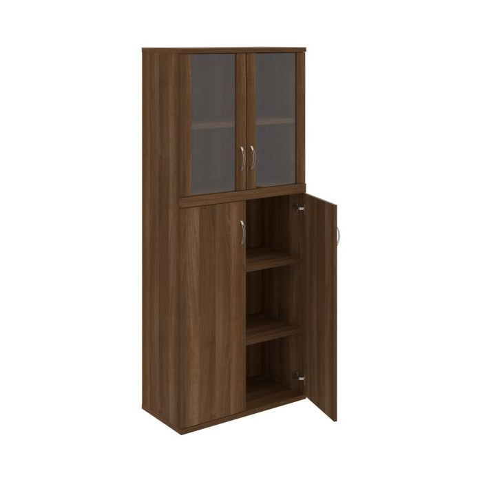 Kombinovaná skriňa - dvere/nika. Kancelárske skrine STRONG majú robustnú konštrukciu a vyššiu nosnosť políc ako bežné kancelárske skrine.V ponuke sú skriňové moduly s výškou 185 cm, 111 cm alebo 74 cm a šírky 80 cm alebo 40 cm. Hĺbka všetkých modelov skriňového radu STRONG je 40 cm.Chrbát, vyrobený z 8 mm hrubých dosák, je obojstranne pohľadový, takže skrine môžete použiť ako priestorový deliaci prvok. Hrúbka samotných políc je 25 mm, čo znamená nosnosť 80 kg na 1 policu.Korpusy, dvierka a police skríň sú olepené odolnou 2mm ABS hranou, ktorá garantuje dostatočnú ochranu proti poškodeniu.