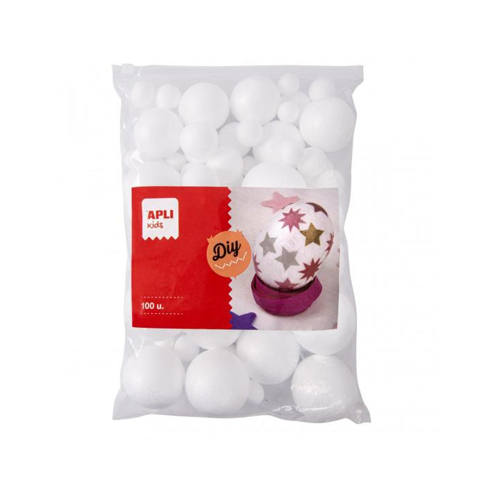Biele polystyrénové gule. Každé vrecko obsahuje 100 guličiek v rôznych veľkostiach: Ø 60 mm (10 kusov), Ø 50 mm (10 kusov), Ø 35 mm (15 kusov), Ø 25 mm (25 kusov), Ø 20 mm (25 kusov) a Ø 10 mm (15 kusov). MAXI formát, ideálny pre školy a skupiny. Gule s vysokou hustotou; ľahko sa režú, maľujú alebo pokrývajú. Ideálne na výrobu dekoratívnych prvkov, bábik fofucha, modelov molekúl, vianočných gúľ alebo na použitie v iných ručných prácach.