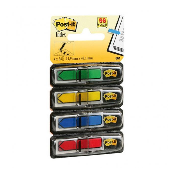 Úzke acetátové záložky do kníh, časopisov, ako register do cenníkov, kartoték, katalógov, zakladačov, archívov a pod. Priehľadná lepiaca čast a farebná časť na označenie.Prelepiteľné, znovunalepiteľné a popisovateľné. Rozmery záložky 12,5x43 mm.Dodávané v kombinácii 4 základných (červená,zelená, modrá, žltá) alebo 4 neónových farieb (žltá, fialová, ružová, modrá) po 24 lístkov.Záložky s potlačou šípky upozorňujú na konkrétnu informáciu v texte. Šírka indexu 12,5 mm, v balení 4 farby po 24 lístkov.