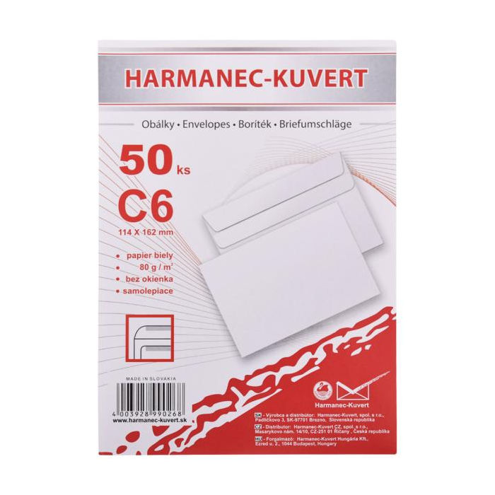 Biele obálky rozmeru 114 × 162 mm, vyrobené z bezdrevného papiera, 80 g/ m2. Samolepiace.