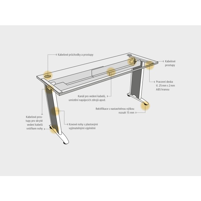 Kancelárský nábytok Flex sa vyznačuje elegantným dizajnom a originalitou technického riešenia. Pracovné dosky s optimálnými rozmermi a tvarom využívajú ergonomicky a efektívne celú pracovnú plochu. Pracovná doska stola má hrúbku 25 mm a je olepená 2mm ABS hranou, ktorá stoly pomáha chrániť pred poškodením. O káble od PC alebo stolovej lampy, sa postará praktická priechodka, ktorá káble jednoducho zvedie pod dosku, kde si s nimi poradia šikovne skonštruované držiaky. Moderné kovové nohy vás oslovia súčasným dizajnom a funkčnosťou. Prepojené sú teleskopickým káblovým kanálom, vďaka ktorému je stôl dokonale stabilný aj bez pracovnej dosky. Okrem toho slúži kanál aj ako elegantný úkryt pre vedenie všetkej kabeláže vášho PC, ktorá je potom pod plastovým krytom kovovej nohy zvedená k podlahe. Tento spôsob vychádza v ústrety aktuálnym trendom kompletne skrytej kabeláže.