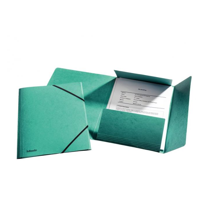 Obal A4 s tromi chlopňami a čiernou gumičkou. Materiál na dotyk príjemný prešpán. Prelisy na chlopniach a chrbte zvyšujú kapacitu obalu. Väčšie balenie 10 ks.