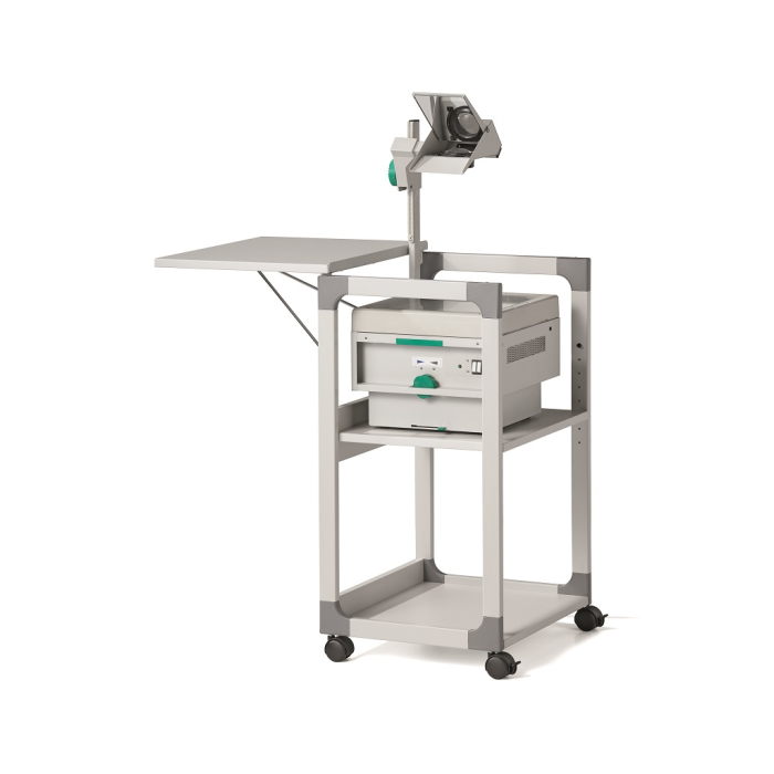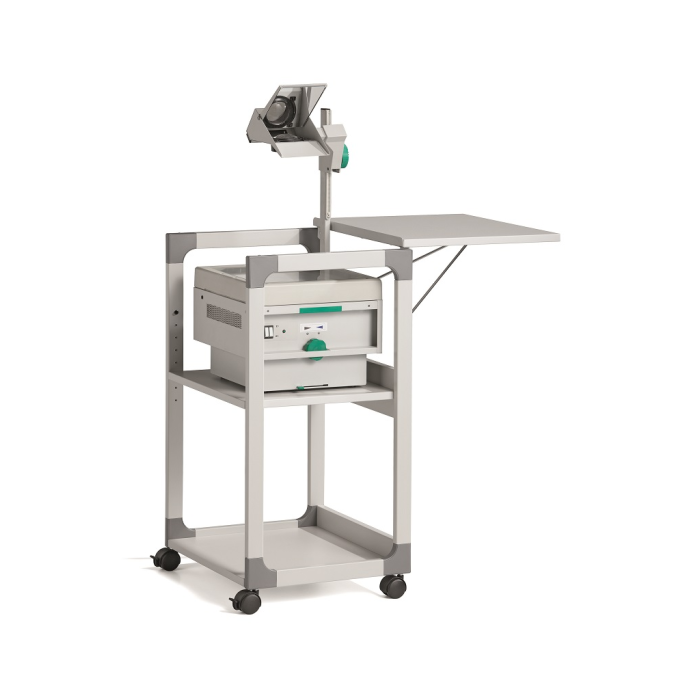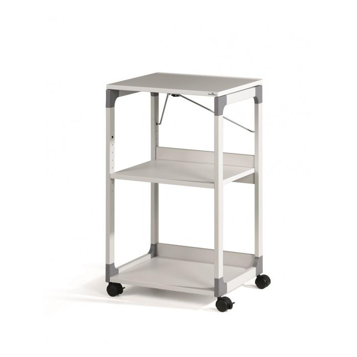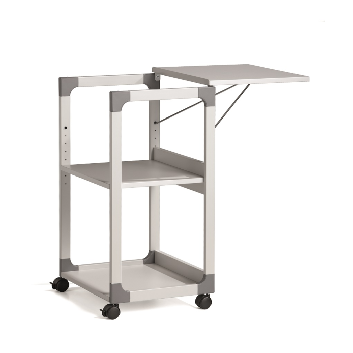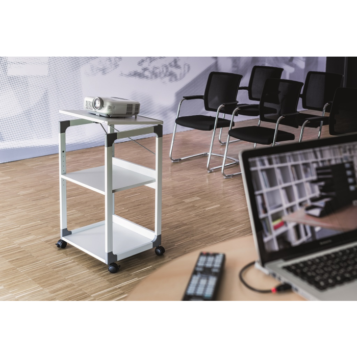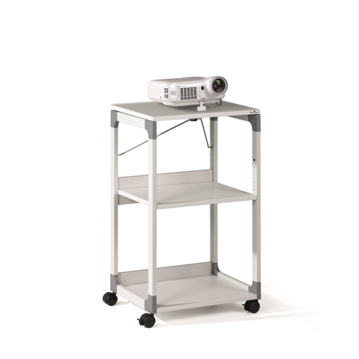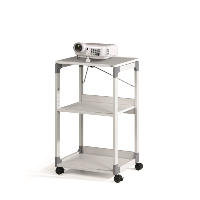 Mobilný projekčný vozík s tromi policami. Horná polica je odnímateľná a pri projekcii sa dá naklopiť do 180°, stredná polica je výškovo nastaviteľná po 32 mm, spodná polica je fixná. Hrúbka políc 19 mm. Materiál pevný kovový lakovaný rám s rohovými spojkami z plastu. Farba sivá. Rozmery š × v × h 508 x 882 x 432 mm.