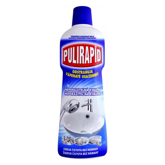Tekutý čistič na vodný kameň Pulirapid Classic čistí a odstraňuje vápenaté usadeniny, stopy hrdze a mydla v kuchyni a kúpeľní. Vhodné použiť na nerezové drezy, keramické umývadla, vane a vodovodné batérie. Naneste pár kvapiek na vlhkú hubku, očistite predmety a opláchnite. Na veľmi znečistené predmety, ako kávovar, umývačky, nerezové časti práčky, kanvica použite neriedený prostriedok a nechajte pôsobiť niekoľko minút. Následne opláchnite. Na veľké plochy - dlaždice, podlahy použite riedenie 60-90ml (2 až 3 uzávery) na 1l vody a opláchnite. Na poháre, príbory a jedálne súpravy použite roztok 120ml prípravku na 1l vody, ponorte predmety do roztoku, nechajte pôsobiť približne 15 minút a opláchnite. Prípravok nepoužívajte na žulu, mramor, farebné lamináty, teplé povrchy a pod. Spôsobuje poleptanie kože. V prípade konzumácie nevyvolávajte zvracanie. Zabráňte kontaktu s očami.