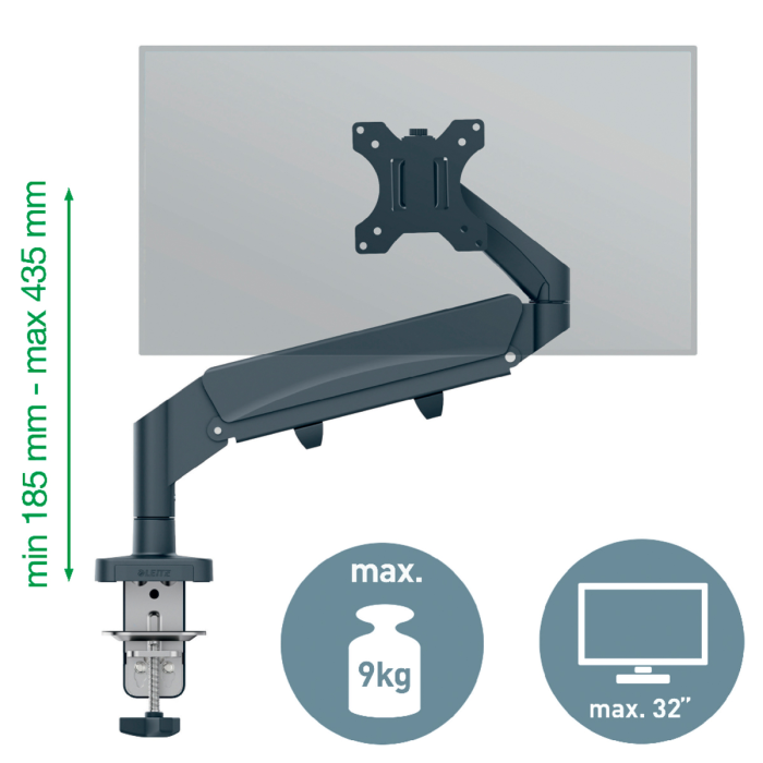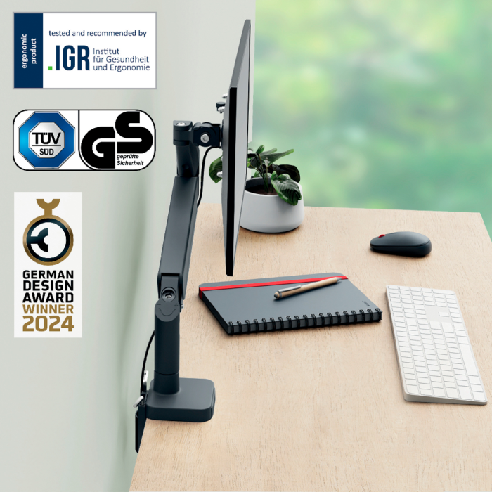 Jednoduchá inštalácia pomocou priloženej odnímateľnej platne Vesa® (75 a 100 mm) a silikónom potiahnutej C-svorky, ktorá znižuje vibrácie a chráni povrch stola, alebo cez otvor pre priechodku (hrúbka dosky stola: 10-80 mm). Vrátane náradia na montáž.
