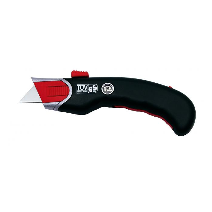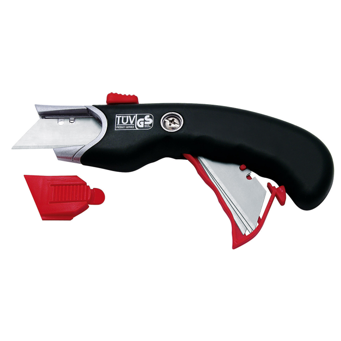 Rezač s pogumovanou rukoväťou a pevnou kovovou hlavicou. Nôž sa vysúva pomocou bežca, ktorý treba počas rezania držať, čo zvyšuje bezpečnosť rezania. Vhodný pre pravákov i ľavákov vďaka umiestneniu bežca v strede rezača. Integrovaný zásobník obsahuje 5 náhradných nožov. Šírka čepele 25 mm. Schválené inštitútom TÜV. Farba čierna/ červená.