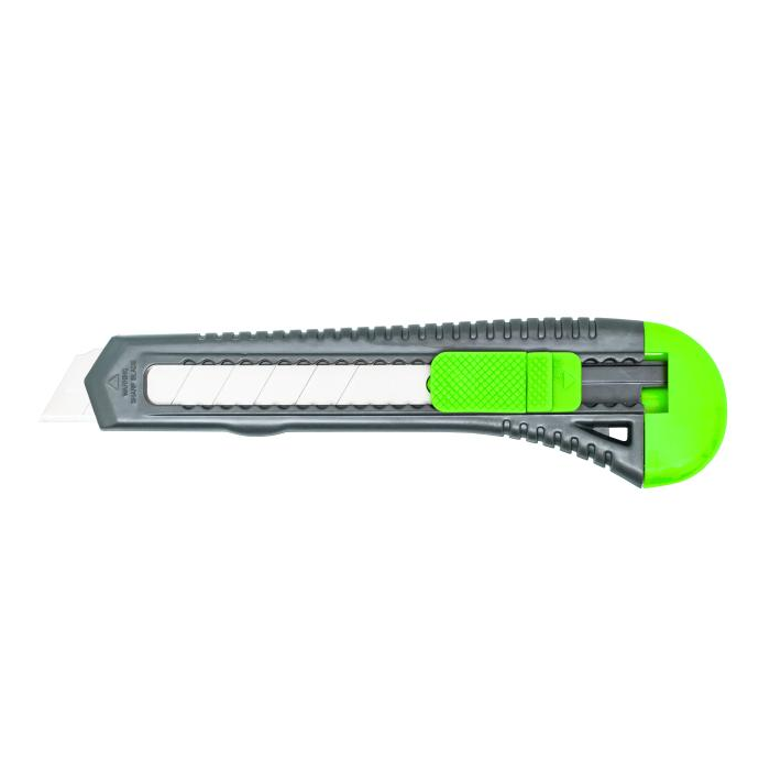Plastový rezač, šírka čepele 18 mm. Farba čierna/ zelená. Úprava plastová.