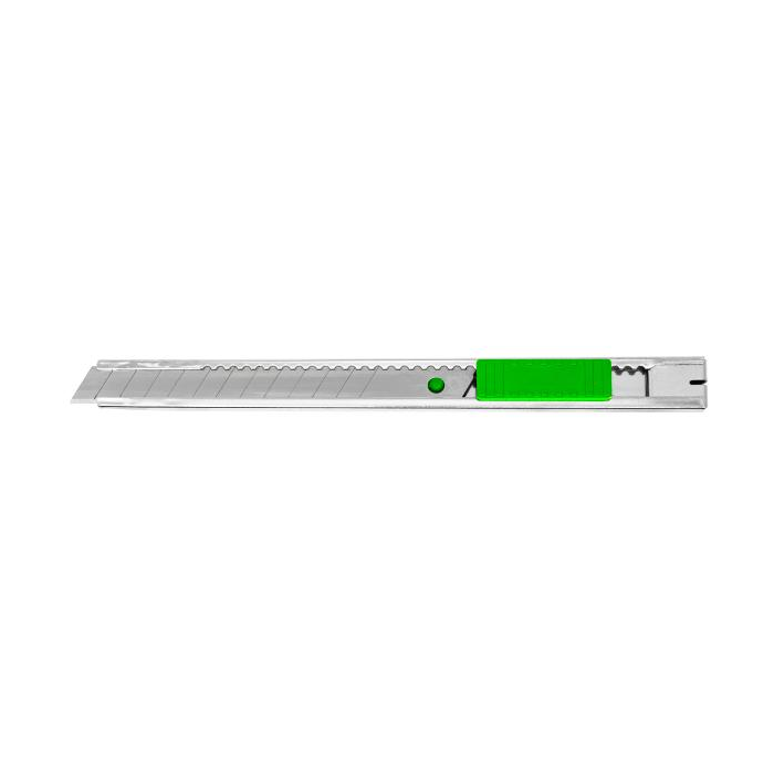 Rezač s kovovým vedením. Šírka čepele 9 mm. Farba čierna/ zelená. Úprava plastová.