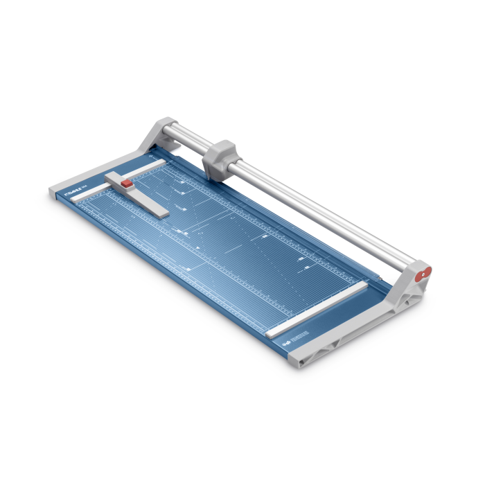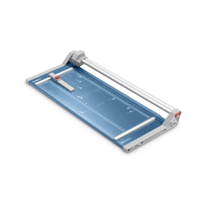 Profesionálna rezačka s kovovou základňou a presným rezom na grafické účely (filmy, fólie, papier). Kruhový nôž umiestnený v plastovom ochrannom kryte sa automaticky brúsi pri rezaní o protinôž - oba nože z tvrdenej ocele. Automatický prítlak pohybom rezacej hlavy, zadný doraz. Mierka v cm/inch. Na pracovnom stole sú vyznačené formáty DIN. Možnosť montáže na stenu.