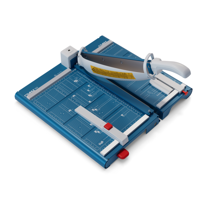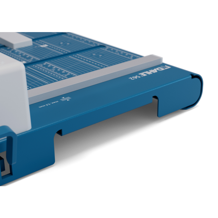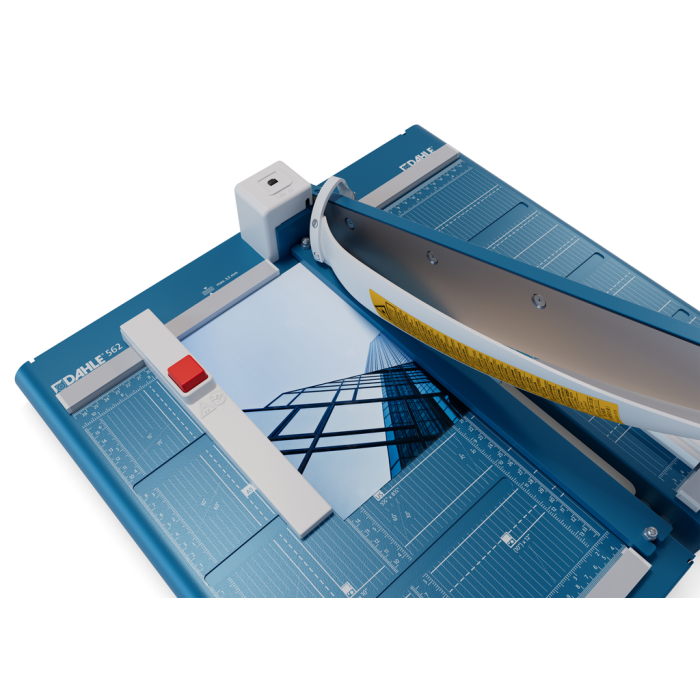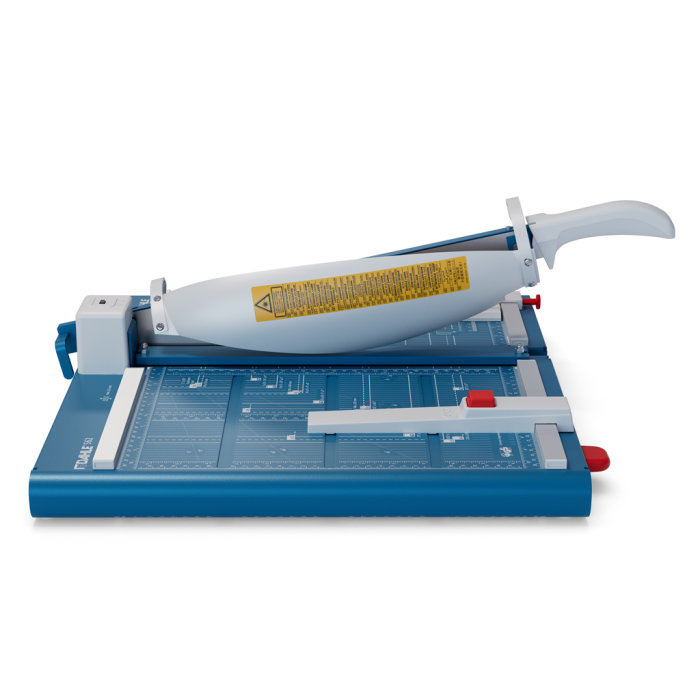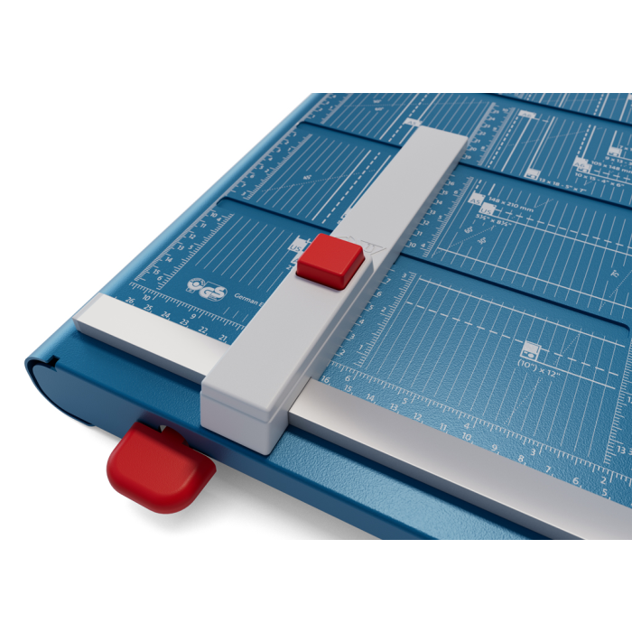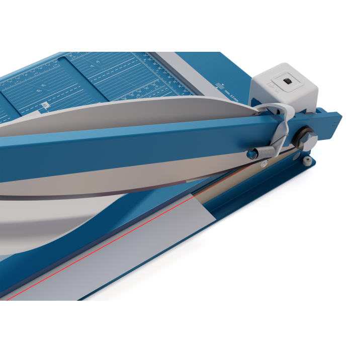 Protišmiková, robustná a presná páková rezačka s kovovou základňou a automatickým prítlakom. Brúsený vrchný a spodný nôž z kvalitnej nožiarskej ocele Solingen, rotujúci kryt okolo ostria. Presná mierka v cm/ inch a DIN formátoch. Výrez na spodnej časti na pohodlné prenášanie. Veľkosť stola 460 × 490 mm. Komfortná výbava s podporným predným stolom a zariadením na rezanie tenkých prúžkov a laserovým lúčom, indikujúcim reznú líniu.