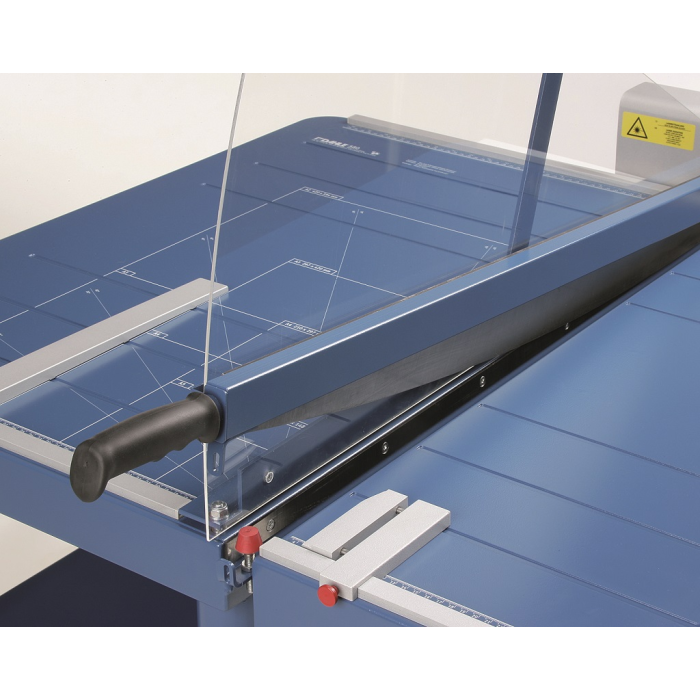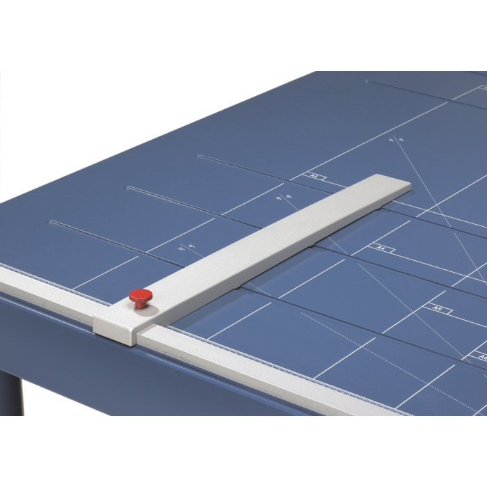 Veľká kovová robustná páková rezačka s vlastným stojanom a uzamykateľným nožom. Brúsený vrchný a spodný nôž z kvalitnej nožiarskej ocele Solingen, rozkladateľný bočný stôl, nožný pedál na zabezpečenie prítlaku rezaného papiera, priehľadný ochranný kryt ostria z plexiskla, 2 bočné dorazy, zadný doraz. Predný doraz, fixovateľný ručnou pákou, vysúvateľný do 275 mm. Mierka v cm/ inch, DIN formáty.K rezačke je možné objednať zariadenie na rezanie tenkých prúžkov a zariadenie umožňujúce vytvoriť laserový lúč, indikujúci reznú líniu.
