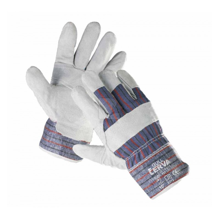 Rukavice z hovädzej štiepenky v dlani s podšívkou, chrbát a manžeta z bavlnenej tkaniny.