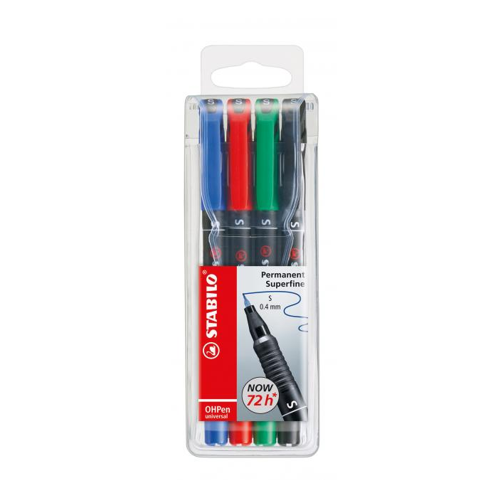 Permanentné popisovače na popisovanie takmer všetkých hladkých povrchov. Nekĺzavá úchytová zóna, praktický klip, bez vrchnáka vydrží až 3 dni. STABILO® OHPen universal Superfine (S). Hrot okrúhly, šírka stopy 0,4 mm.Väčšie balenie 5 sád. Sada 4 farieb.