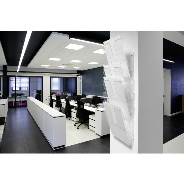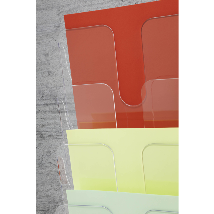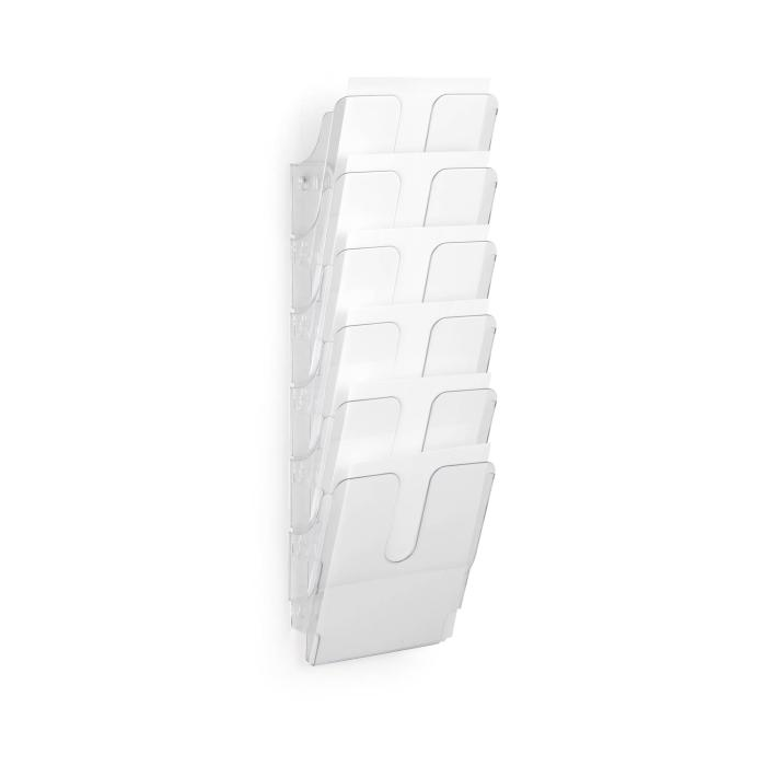 Sada stojanov na prospekty so 6 priehradkami veľkosti A4 na letáky, časopisy, firemnú literatúru a ďalšie. Vyrobená z priehľadného plastu odolného voči opotrebeniu. Vhodná na montáž na stenu, na vystavenie literatúry na recepciách a v kanceláriiách. Rozmery : 1080mm x 247mm x 100mm. Farba priehľadná.