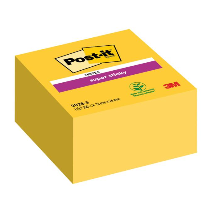 Post‑it® Super Sticky kocka so špeciálnym lepidlom, vďaka ktorému držia lístky aj na nerovnom povrchu. V balení 350 lístkov rozmerov 76 × 76 mm. Farba ultra žltá.