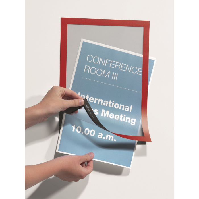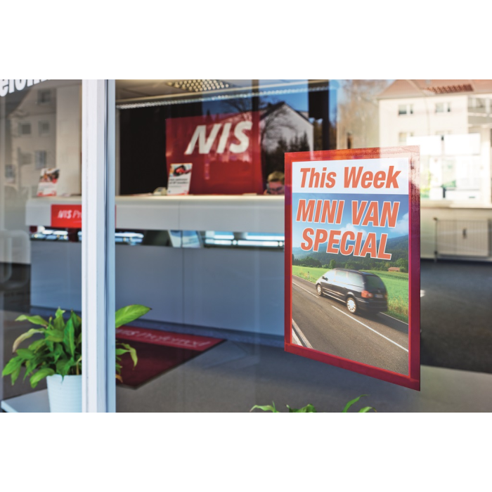 Samolepiaci informačný panel s prednou magnetickou časťou. Ideálny na vystavovanie plagátov, kľúčových informácií, špeciálnych oznamov alebo dôležitých čísel. Informácie sa ľahko vymieňajú a sú čitateľné z oboch strán, ak sa panel umiestni napr. na okno alebo priehľadné dvere. Vhodný na hladké a pevné povrchy. V prípade potreby je ľahko premiestniteľný bez potreby vŕtania. Formát A4, rámik červený.