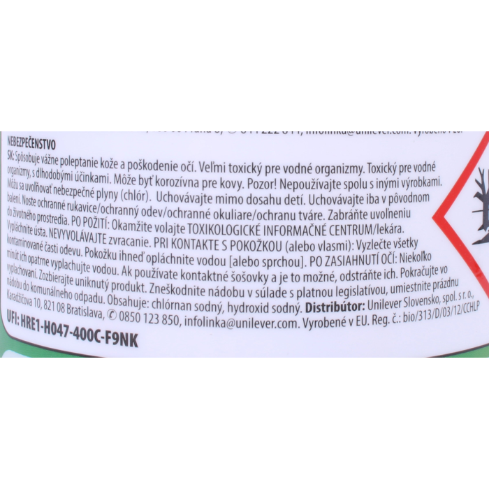 Spôsobuje ťažké poleptanie kože a poškodenie očí. Veľmi toxický pre vodné organizmy. Toxický pre vodné organizmy, s dlhodobými účinkami. Môže byť korozívna pre kovy. Pozor! Nepoužívajte spolu s inými výrobkami. Môžu sa uvoľňovať nebezpečné plyny (chlór). Uchovávajte mimo dosahu detí. Uchovávajte iba v pôvodnom balení. Používajte ochranné rukavice/ ochranný odev/ ochranné okuliare/ tvárový štít. Zabráňte uvoľneniu do životného prostredia.