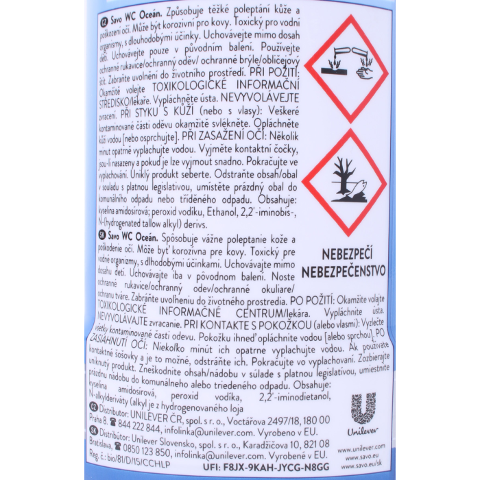 Pri kontakte s pokožkou (ALEBO VLASMI): Vyzlečte všetky kontaminované často odevu. Pokožku ihneď opláchnite vodou (alebo sprchou). PO ZASIAHNUTÍ OČÍ: Niekoľko minút ich opatrne vyplachujte vodou. Ak používate kontaktné šošovky a je to možné, odstráňte ich. Pokračujite vo vyplachovaní. Okamžite volajte TOXIKOLOGICKÉ INFORMAČNÉ STREDISKO alebo lekára.Zozbierajte uniknutý produkt, Zneškodnite nádobu v súlade s platnou legislatívou, umiestnite prázdnu nádobu do komunálneho odpadu. Obsahuje peroxid vodíka, kyselinu amidosírovú.