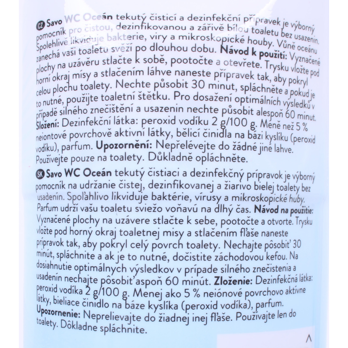 Tekutý koncentrovaný prípravok s dezinfekčným účinkom k pravidelnému čisteniu a údržbe sociálnych zariadení. Likviduje zápach a je vysokoúčinný proti baktériám. SAVO ocean vyčistí i hlboko usadené nečistoty spôsobené vápenatými a horečnatými iontami.