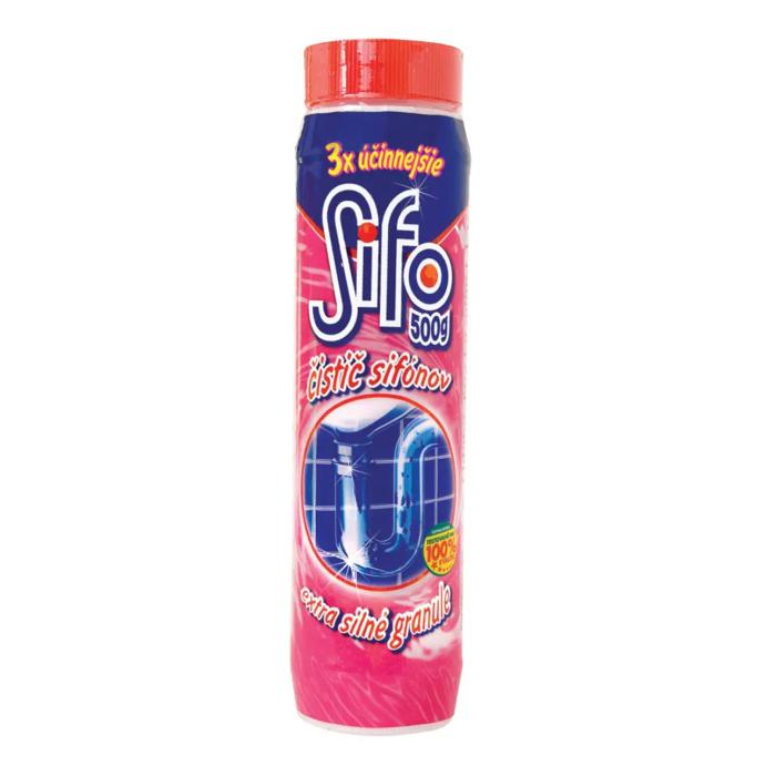 Prostriedok na čistenie sifónov a odpadov. Sifo je určený na čistenie sifónov umývadiel, výlevok, vaní, WC a kuchynských drezov. Rozpúšťa kuchynské odpady, mastné usadeniny, vlasy. 3x účinnejšie, Extra silné granule. Hmotnosť 500 g.