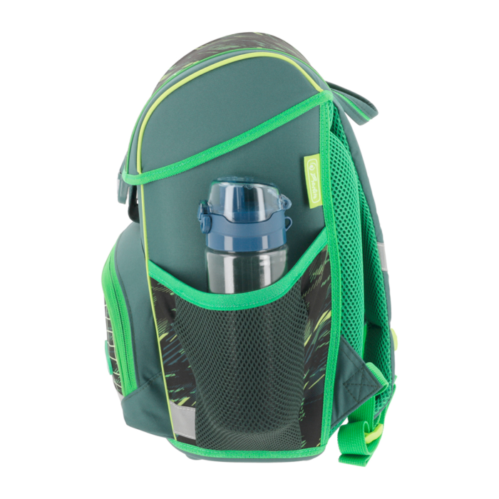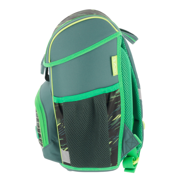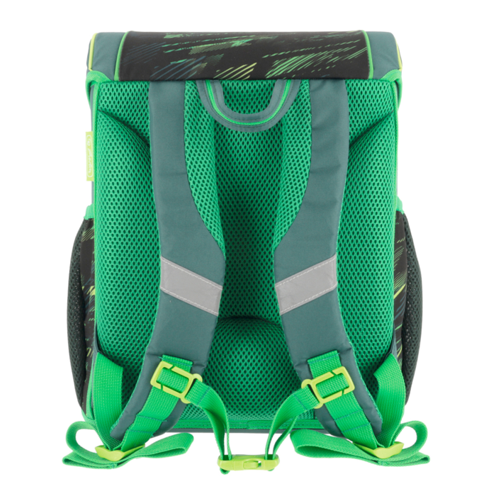 Školská taška s výbavou, ergonomicky tvarovaným a priedušným polstrovaním chrbta, nastaviteľnými ramennými popruhmi, výškovo nastaviteľným hrudným pásom, hlavným vreckom s priestorom na knihy, bočnými vreckami s elastickými pásikmi, predným vreckom na zips, stabilnou spodnou doskou s nožičkami, pohodlnou rukoväťou a reflexnými prvkami Oralite. Hmotnosť 950 g, objem 16 l, rozmery 37 x 31 x 22 cm. Vode-odolná, bez PVC, výbava: peračník, vrecko na prezuvky, okrúhle puzdro. Certifikát ergonómie 2023 a 2025. Materiál: Polyester.