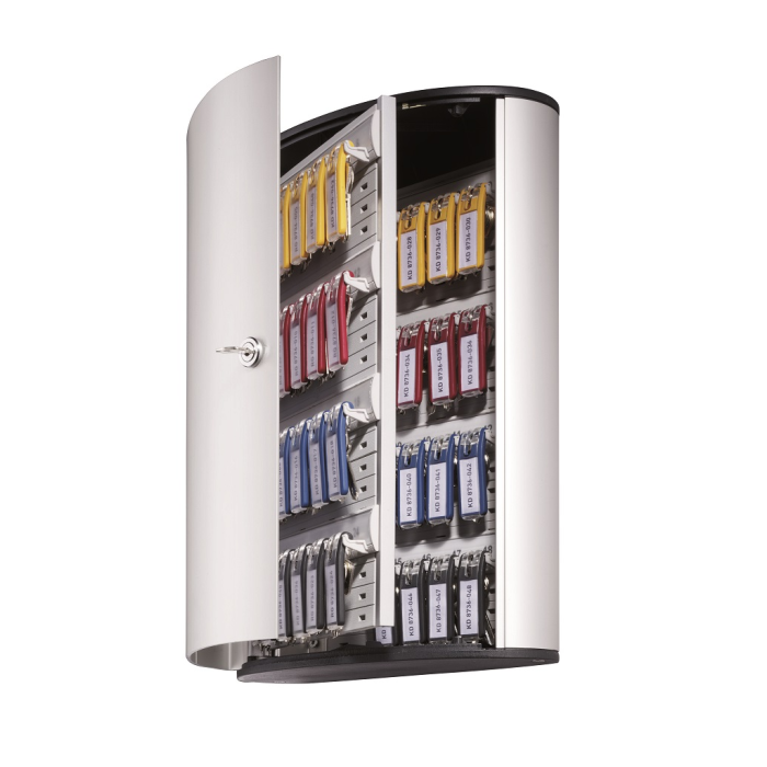Veľká skrinka na 48 kľúčov s dvierkami, otvárajúcimi sa z dôvodu lepšej obsluhy v 180° uhle. Jednoduchá montáž na stenu. Súčasťou balenia je montážna sada, 2 bezpečnostné kľúče a 6 menoviek na kľúče v rôznych farbách. Farba strieborná.