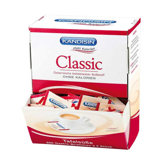 Umelé sladidlo Kandisin, porciované, balené 500 ks po dvoch tabletách. Vyrobené na báze cyklamátu a sacharínu. Tableta KANDISINU má sladivosť ako jedna čajová lyžička cukru a má iba 0,02 kcal. Prípravok nie je určený ako náhrada vyváženej a pestrej stravy.