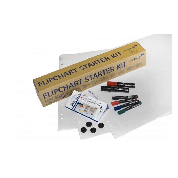 Praktická sada príslušenstva k flipchartom, obsahujúca 3 flipchartové 20 listové bloky, 2 popisovače TZ 48 v čiernej a červenej farbe, sadu 4 popisovačov TZ 41 v základných farbách, 4 magnety priemeru 30 mm a brožúrku s tipmi, ako napr. používať príslušenstvo v kombinácii s typom zakúpeného flipchartu, ako kresliť grafy so špeciálnymi popisovačmi Legamaster tak, aby boli jasné a čisté a ako efektívne využívať flipchartové bloky.