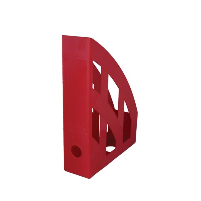 Plastový stojan na časopisy zaoblený dizajn - odolný materiál, miesto na etiketu na chrbte. Farba červená.