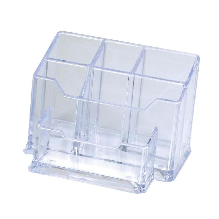 Priehľadný šesťdielny stojan na písacie potreby z tvrdeného akrylového plastu odolného voči prasknutiu. Rozmery 147 × 100 × 100 mm.