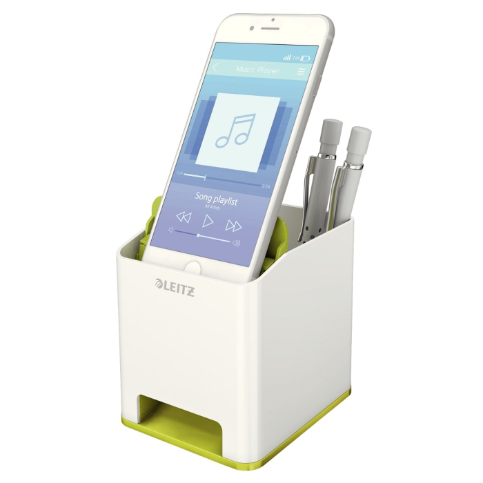 Neprehliadnuteľný štýlový stojan na perá v prémiovej kvalite Leitz v štýlových žiarivých farbách WOW. Extra odkladač pre smartphone do veľkosti iPhone 6 plus so špeciálnou funkciou pre zosilovanie zvuku, veľa miesta pre písacie potreby, pravítko, stylus a iné drobnosti. Moderný dizajn, ktorý vyzerá rovnako dobre v kancelárii, ako aj doma na pracovnom stole, dobre dopĺňa ostatné produkty radu WOW.