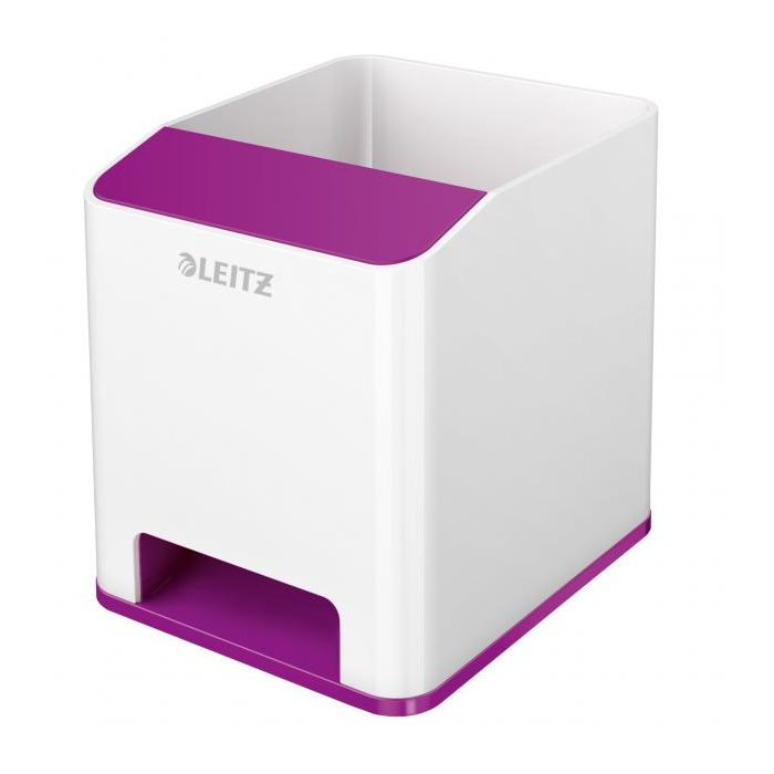 Neprehliadnuteľný štýlový stojan na perá v prémiovej kvalite Leitz v štýlových žiarivých farbách WOW. Extra odkladač pre smartphone do veľkosti iPhone 6 plus so špeciálnou funkciou pre zosilovanie zvuku, veľa miesta pre písacie potreby, pravítko, stylus a iné drobnosti. Moderný dizajn, ktorý vyzerá rovnako dobre v kancelárii, ako aj doma na pracovnom stole, dobre dopĺňa ostatné produkty radu WOW. Farba purpurová.