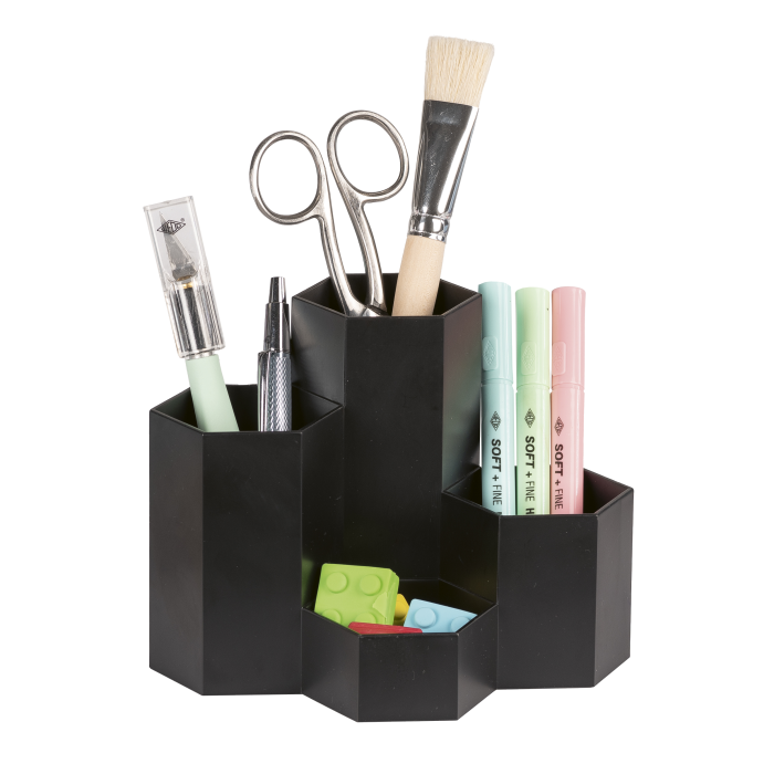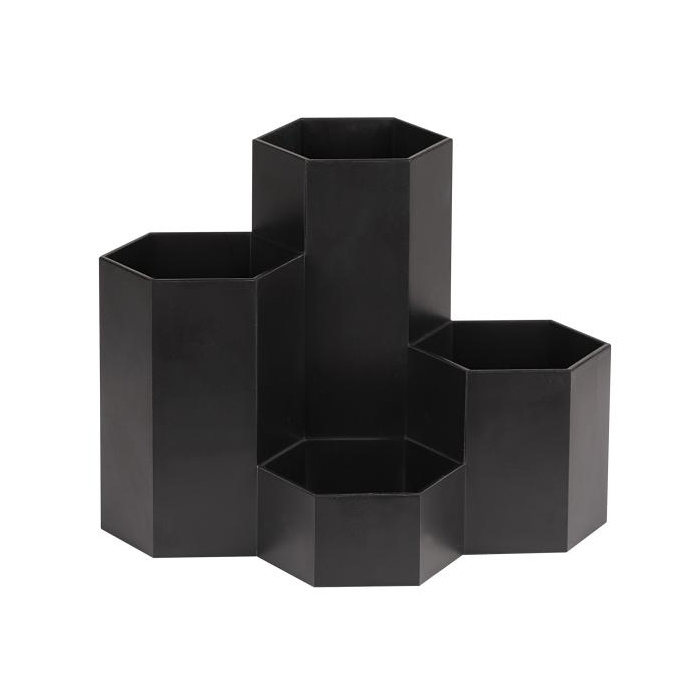 Stojan na perá so šesťuholníkovými trubicami je vyrobený z mimoriadne odolného a nárazuvzdorného polypropylénu. Vďaka tvaru včelieho plástu ho možno zoskupiť, aby sa ušetrilo miesto. 4 trubice, usporiadané v rôznych výškach, ponúkajú voľný priestor na pravítka, štetce, nožnice, perá a samozrejme aj na menšie predmety na stole, ako sú strúhadlá a gumy.