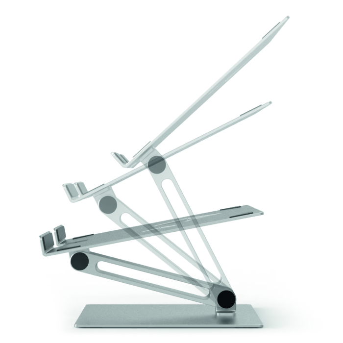 Univerzálny nastaviteľný stojan na stôl pre notebooky a tablety od 10” do 17”. Uľahčuje prácu vďaka ergonomickej a flexibilnej nastaviteľnosti výšky a uhla sklonu. Umožňuje používanie notebookov ako stolových monitorov (v kombinácii s externou klávesnicou a myšou). Vysoko stabilný pre bezpečnú prácu. Protišmykový gumený povrch chráni zariadenie pred poškriabaním. Mimoriadne robustný.