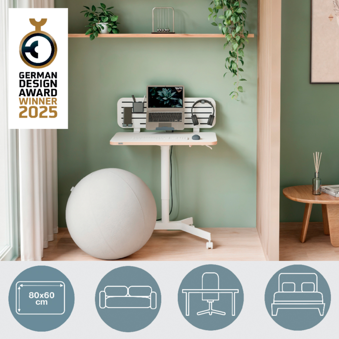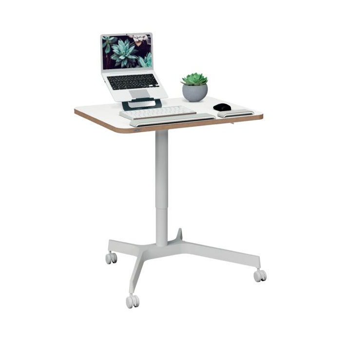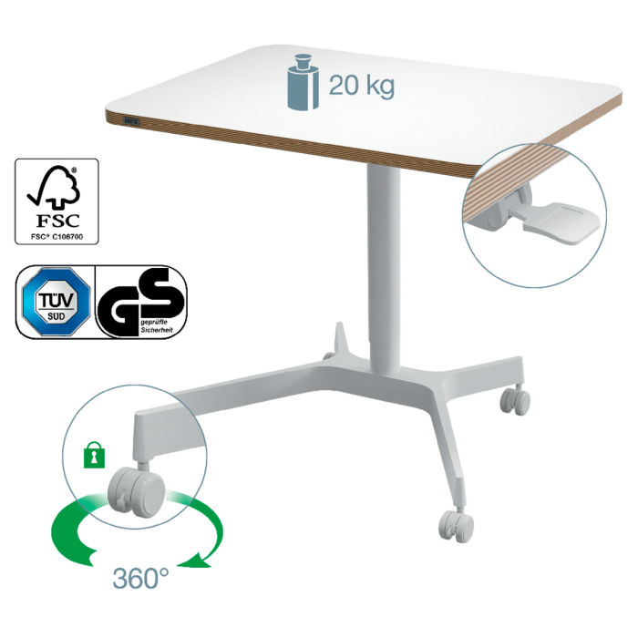 Pneumatický stôl na sedenie/státie s kompaktnou stolnou doskou (80 x 60 cm) na použitie s notebookom (neodporúča sa používať s monitorom)