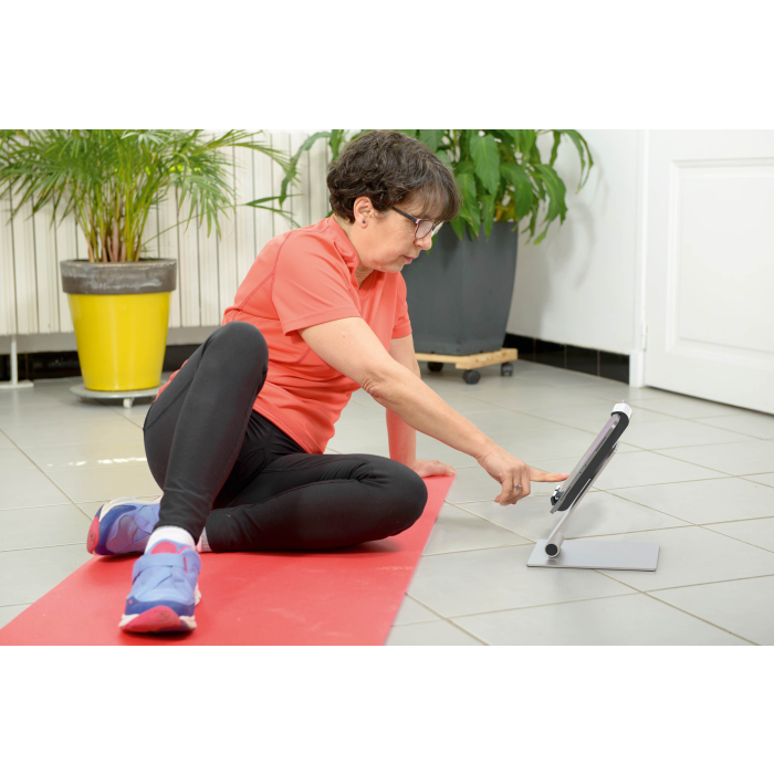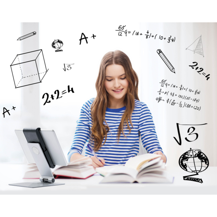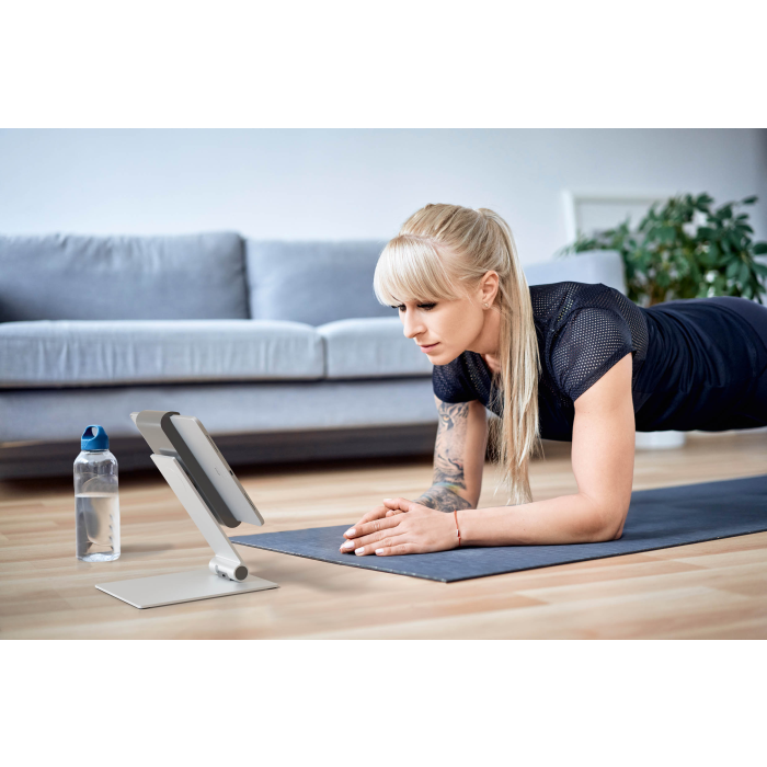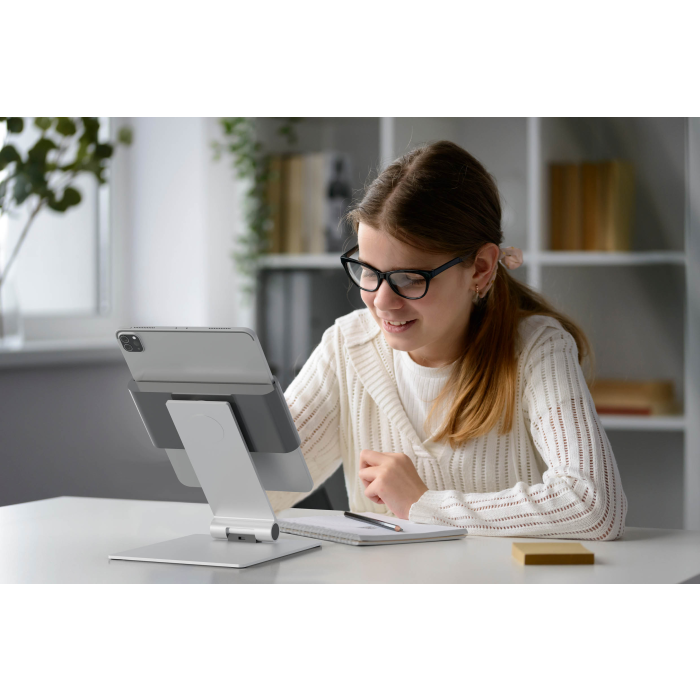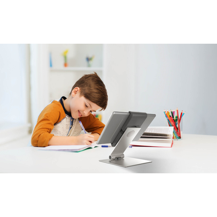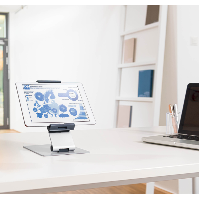 Rotačný stojan 360 ° na stôl na tablety od 7 do 13 ` na výšku alebo na šírku s jednoduchým vkladaním a vyberaním tabletu. Uchytávacie body po 90 °, ochrana pred bočným vybratím tabletu, premenlivý uhol sklonu ramena od 0 ° do + 88 °, symetrické otváranie držiaka od 160 do 275 mm. Otvor v stojane slúži ako výstup pre nabíjací kábel. Uzamknutie držiaka pomocou špeciálneho kľúča. Materiál hliník, ASB a oceľový plech. Dodatočná ochrana proti krádeži pomocou káblového zámku (nie je súčasťou balenia). Rozmery 155 × 242 × 183 mm.