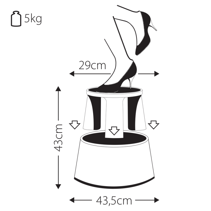 Bezpečný spôsob ako sa dostať na nedostupné miesta. Stupienok vyrobený z kovu, resp. plastu, miesta na stúpanie potiahnuté protišmykovou gumou. Tri vsadené kolieska umožňujú úplnú pojazdnosť. Pri používaní sa kolieska z dôvodu bezpečnosti zatiahnu. Výška 43 cm, vrchný priemer 41,5 cm, spodný priemer 44,5 cm. Nosnosť 150 kg. Farba čierna.