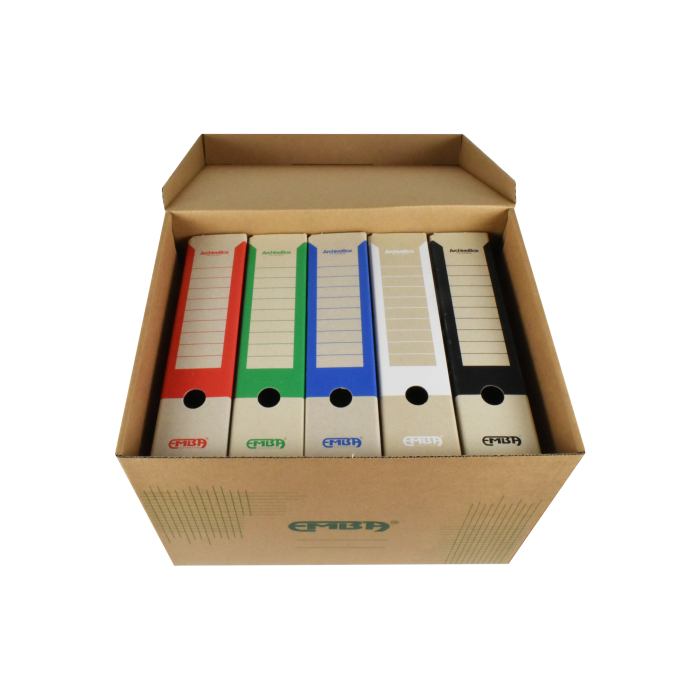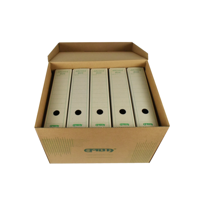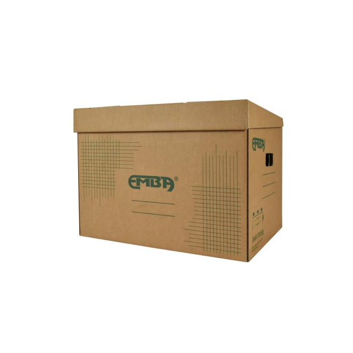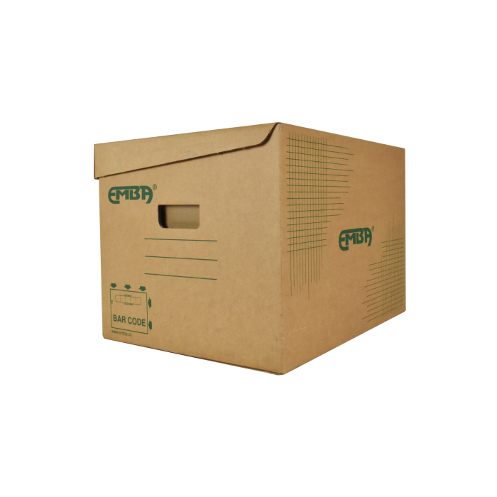 Škatuľa z hnedej vlnitej lepenky so sklápacím vekom a zelenou potlačou na ukladanie a archiváciu 5 zakladačov šírky 8 cm alebo archívnych boxov I/-75 mm. Rozmery (š x v x d) 425 x 330 x 300 mm. Nosnosť 100 Kg.