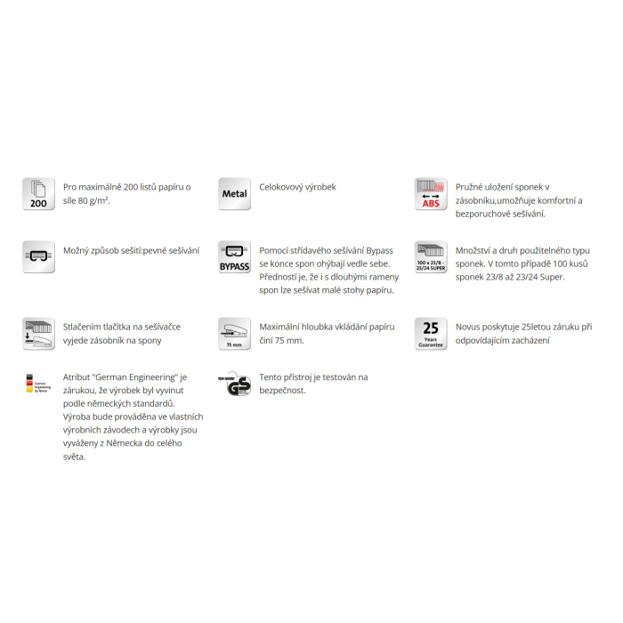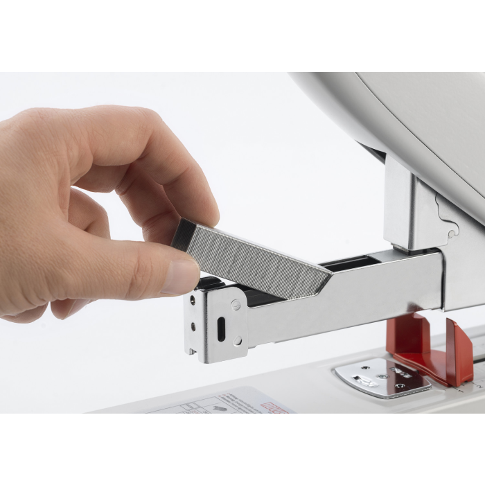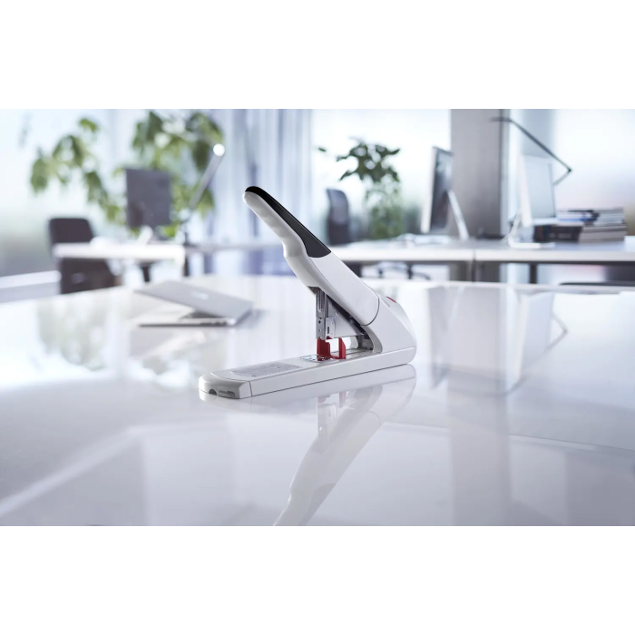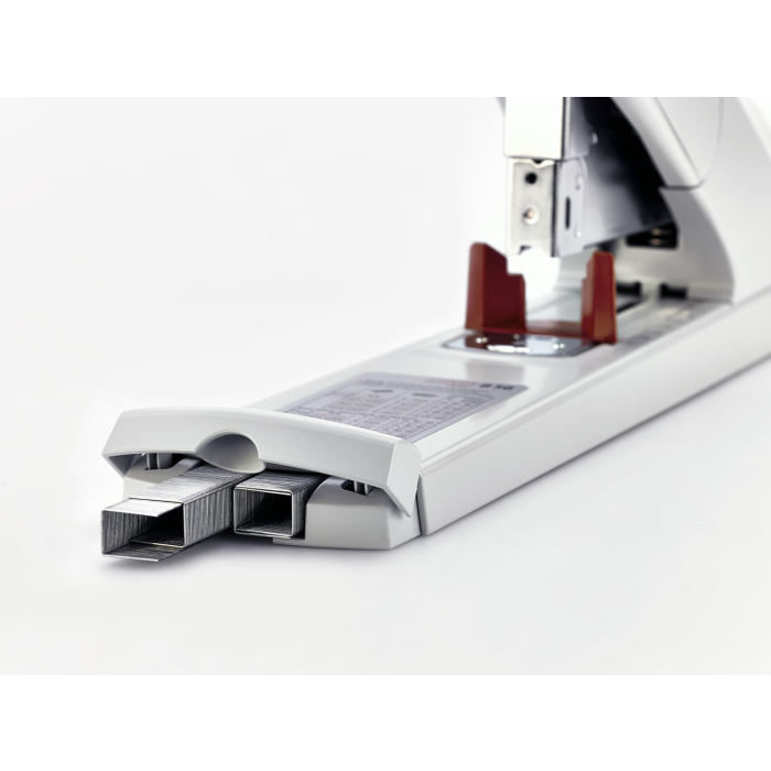 Extrémne silná celokovová veľkokapacitná zošívačka s plastovým telom. Kapacita zošívania do 210 listov, vybavená anti blokovacím ABS systémom pre bezproblémové zošívanie. Kovový zásobník s dvojitým vedením spiniek. Systém „bypass“ umožní použitie iba jednej veľkosti spiniek tým, že spinku ohne do bokov. Kapacita náplne 100 spiniek 23/ 8 až 23/ 24 SUPER. Variabilná hĺbka zošívania do 7,5 cm. Hmotnosť cca 2 100 g. Záruka 25 rokov. Farba sivá.