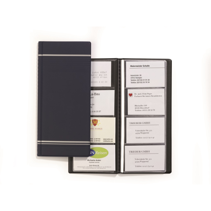Vizitkár v prevedení matné PVC s dekoračnými prúžkami so zatavenými obalmi. Kapacita 96 vizitiek. Rozmery 118 × 250 mm.