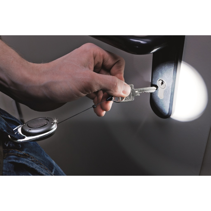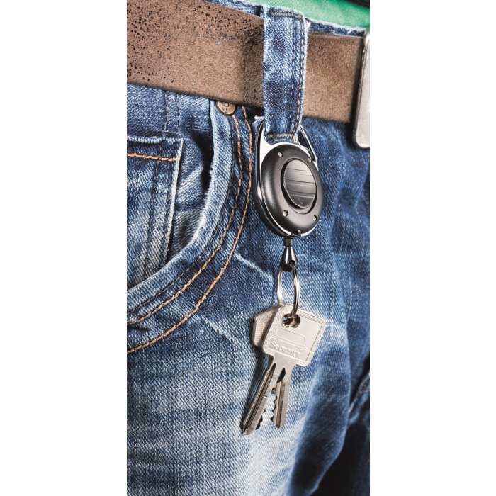 Štýlový kotúč s oválnym plastovým telom a kovovým klipom s kľúčovým krúžkom a Led svetlom na orientáciu v tme. Vysunutie kotúča do dĺžky 80 cm. Vhodný na uchytenie všetkých visačiek značky DURABLE s perforáciou.