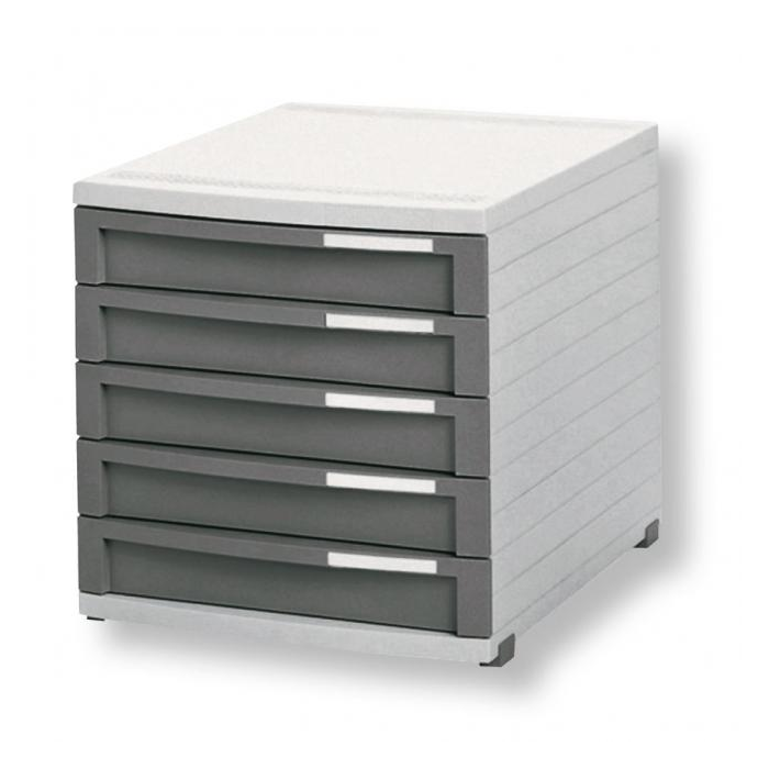 Box z modulárneho systému zásuvkových boxov s horizontálnym aj vertikálnym spájaním. Model so zatvorenými zásuvkami výšky 50 mm a zarážkou chrániacou zásuvky pred úplným vysunutím. Súčasťou sú identifikačné menovky na označenie zásuviek.Telo boxov vo svetlosivej farbe, zásuvky tmavosivé. Rozmery (š × v × h) 30 × 30,7 × 38,2 cm.
