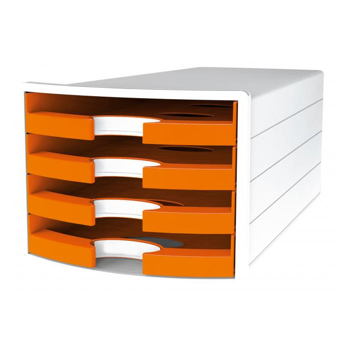 Box so štyrmi otvorenými zásuvkami v tvare počítačového monitora v trendových farbách. Rozmery (š × v × h) 294 × 235 × 368 mm. Farba oranžová.