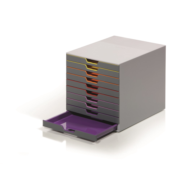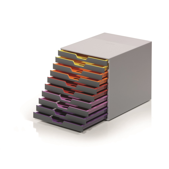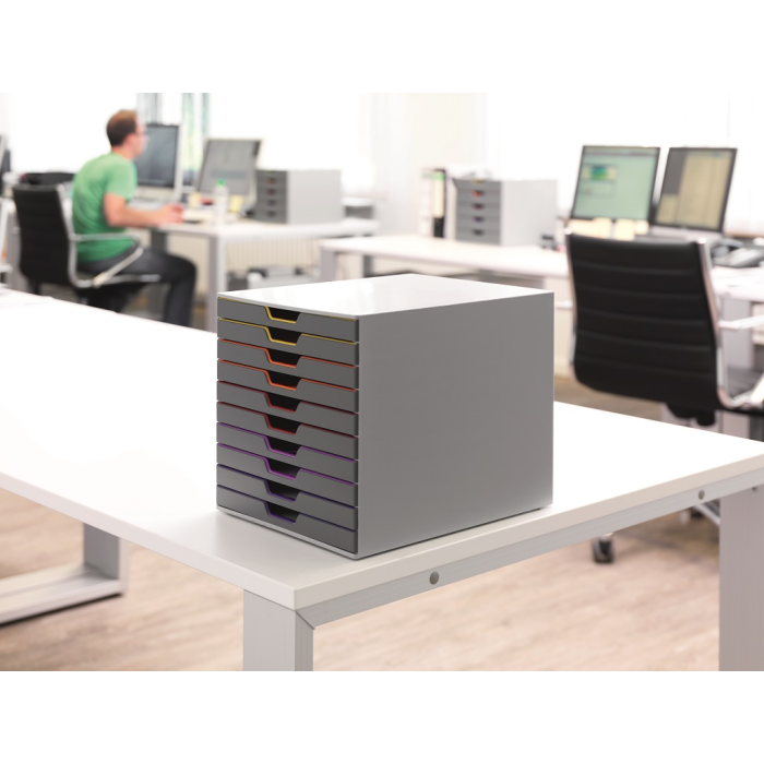 Boxy s 10 zásuvkami s vnútrami dúhových farieb dodajú kancelárii nádych elegancie. Pri ich zatvorení farebné línie iba jemne vystupujú z elegantnej sivej farby, pri otvorení sú žiarivé farby dúhy potešením pre oči. Dodávané s priehľadnými plastovými indexami na označenie obsahu. Boxy sú stohovateľné, zásuvky zabezpečené proti vypadnutiu. Materiál najkvalitnejší ABS plast, tichý a ľahký posun zásuviek, spodná strana s protišmykovou ochranou. Víťaz Product design award 2013. Rozmery (š × v × h) 292 × 280 × 356 mm.