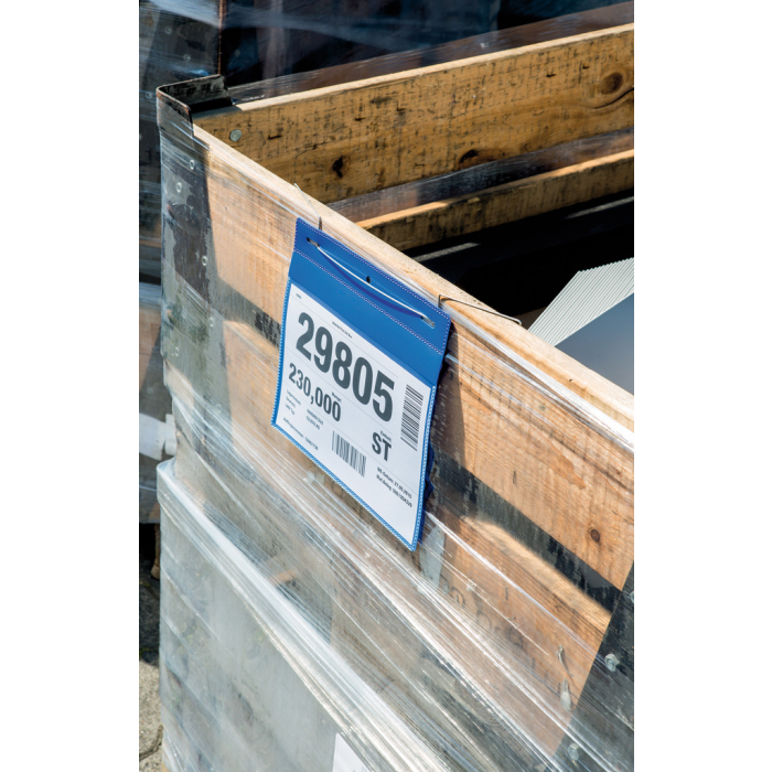 Vrecko s pozinkovaným, flexibilným drôtom pre ľahké a bezpečné upevnenie. Vhodné napr. na sieťované kontajnery, rúry a prepravné kontajnery. Použiteľné aj v exteriéri vďaka ochrannej chlopni chrániacej dokumenty pred prachom a vlhkosťou. Formát A5. Farba modrá.