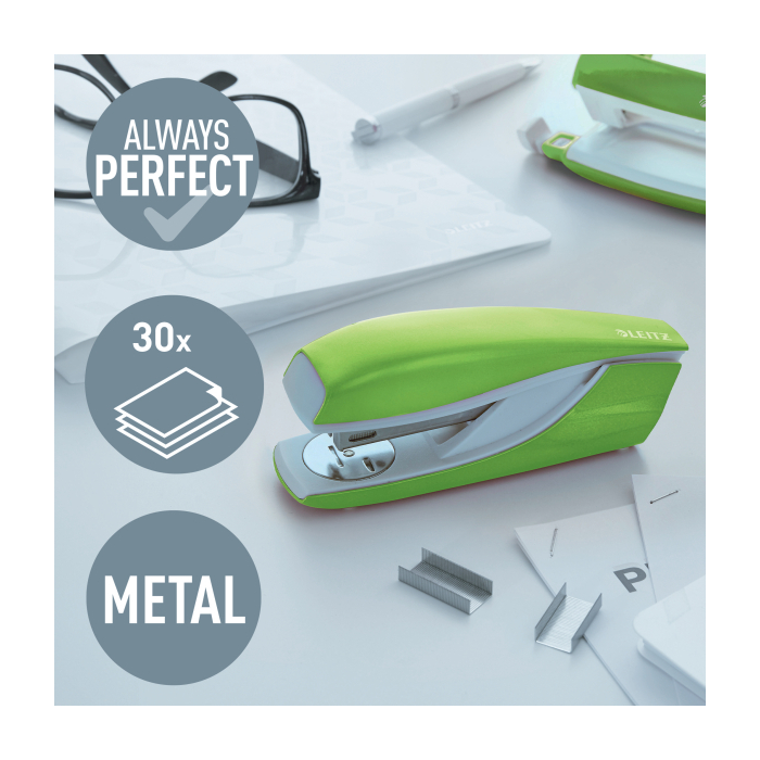Pevná a spoľahlivá celokovová zošívačka. V farbách radu Leitz WOW a s patentovanou zošívacou technológiou. Základňa z kovu, rameno kov/plast. Protišmykové plastové dno proti poškodeniu nábytku. Kapacita zošívania: 30 listov (80 g/m2).