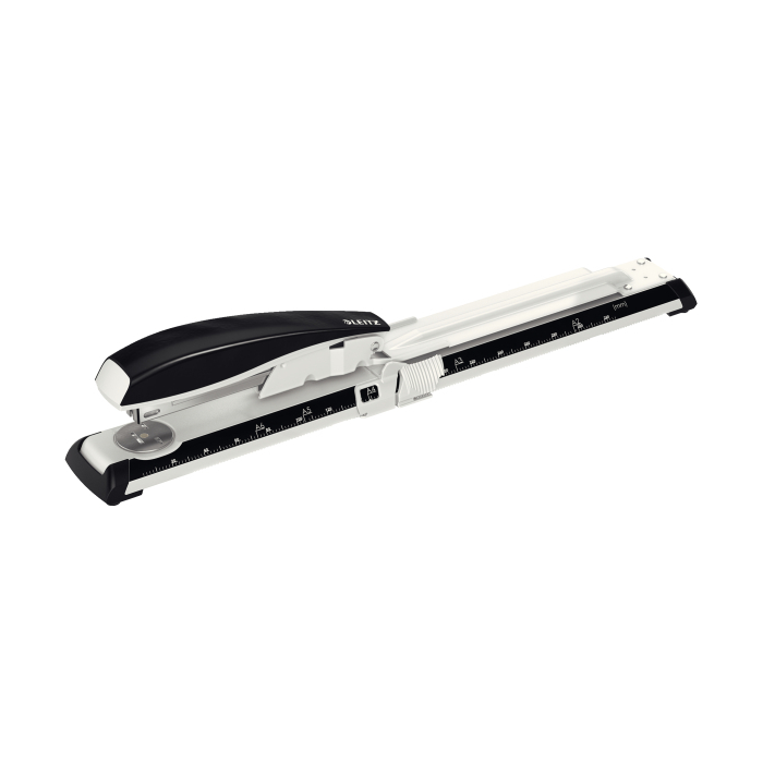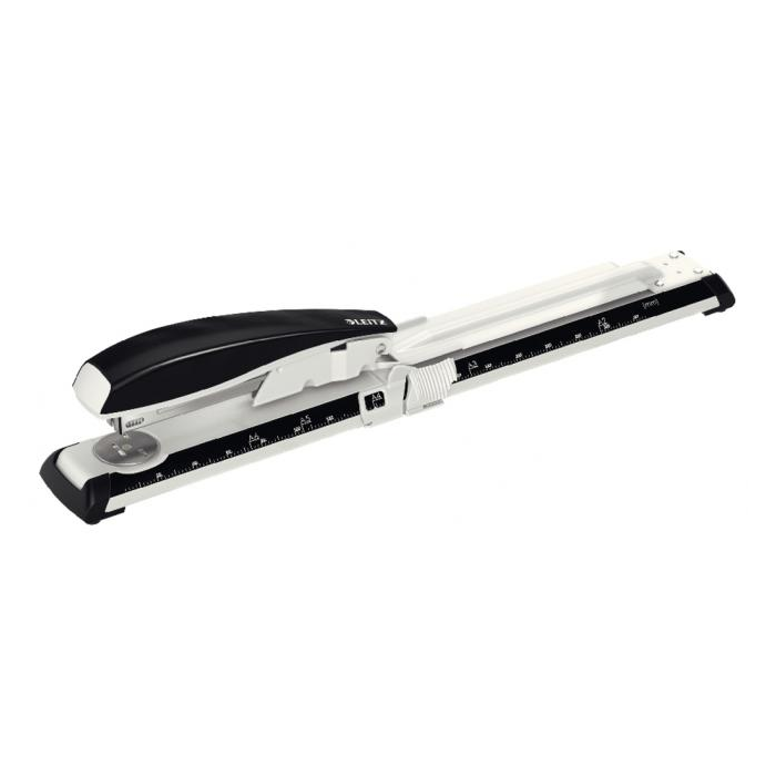 Kvalitná výkonná zošívačka na zošívanie veľkých formátov a zošívanie uprostred dokumentu, napr. brožúr. Patentovaná zošívacia technológia DIT na vždy spoľahlivé zošitie. Najlepšie výsledky dosiahnete v kombinácii s drôtikmi Leitz Power Performance P3 (24/6, 26/6) alebo P4 (24/8, 26/8). Kapacita zošívania: 40 hárkov (80 g/m2). Doraz nastaviteľný na formáty A2 až A6, medzinárodné formáty US-Norma a Foolscap. Hĺbka vkladania až 300 mm. Otočná nákovka na zmenu typu zošívania - otvorené a uzavreté zošívanie, otvorením ramena o 180° je možné aj zošívanie nástenkové. Kapacita zošívania: 40 hárkov (80 g/m2). Farba čierna.