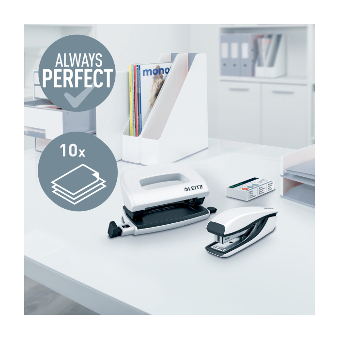 Malá zošívačka v moderných žiarivých farbách ideálna nielen do kancelárie, ale aj domov alebo na cesty. Vždy perfektné zošitie vďaka patentovanej technológii DIT. V kombinácii so spinkami  Leitz Power Performance P2 (č. 10) dosiahnete vždy jednoduché a správne zošitie.Kapacita 10 hárkov. Vrecková zošívačka. Patentovaná technológia DIT na spoľahlivé zošívanie. Balenie v škatuľke, vrátane spiniek. Otvorením ramena o 180° je možné použiť nástenkové zošívanie (takrovanie). Farba biela.