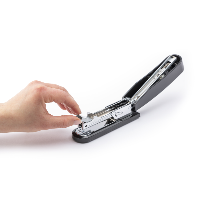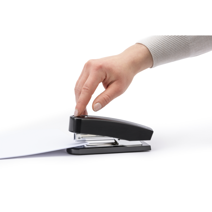 Ľahká zošívačka s kovovým zásobníkom a jednoduchým vedením spiniek. Kapacita náplne 100 spiniek 24/-6 alebo 150 spiniek 26/-6. Hĺbka zošívania 6,5 cm. Hmotnosť 175 g. Záruka 10 rokov.